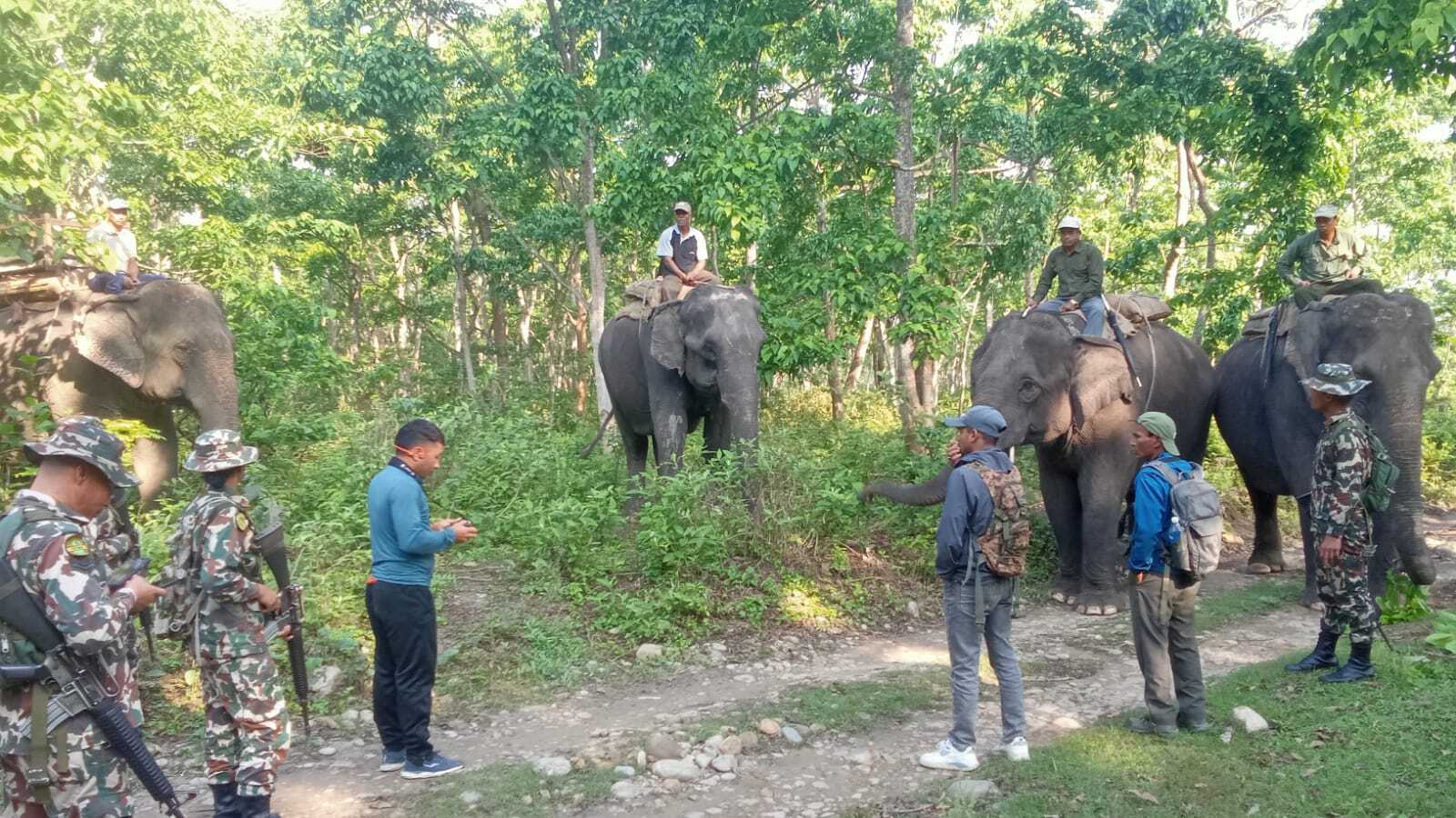 On March 24, a comprehensive search of the entire Radha Krishna Community Forest was conducted using five elephants, with participation from the Nepal Army, park rangers, and NTT technicians. Although the tiger was not located, fresh tracks indicated that MT03 Bhale had crossed the Rapti River and moved into Chitwan National Park.